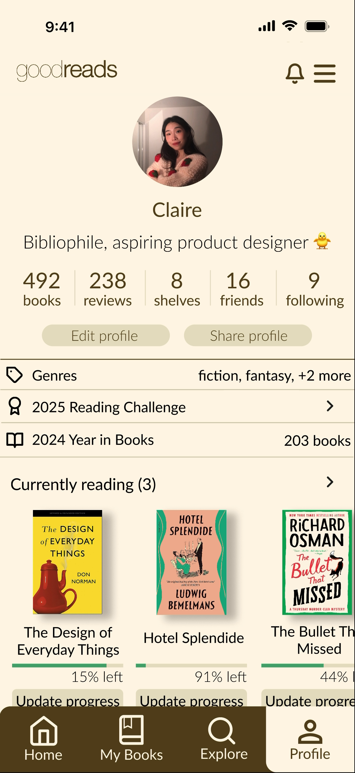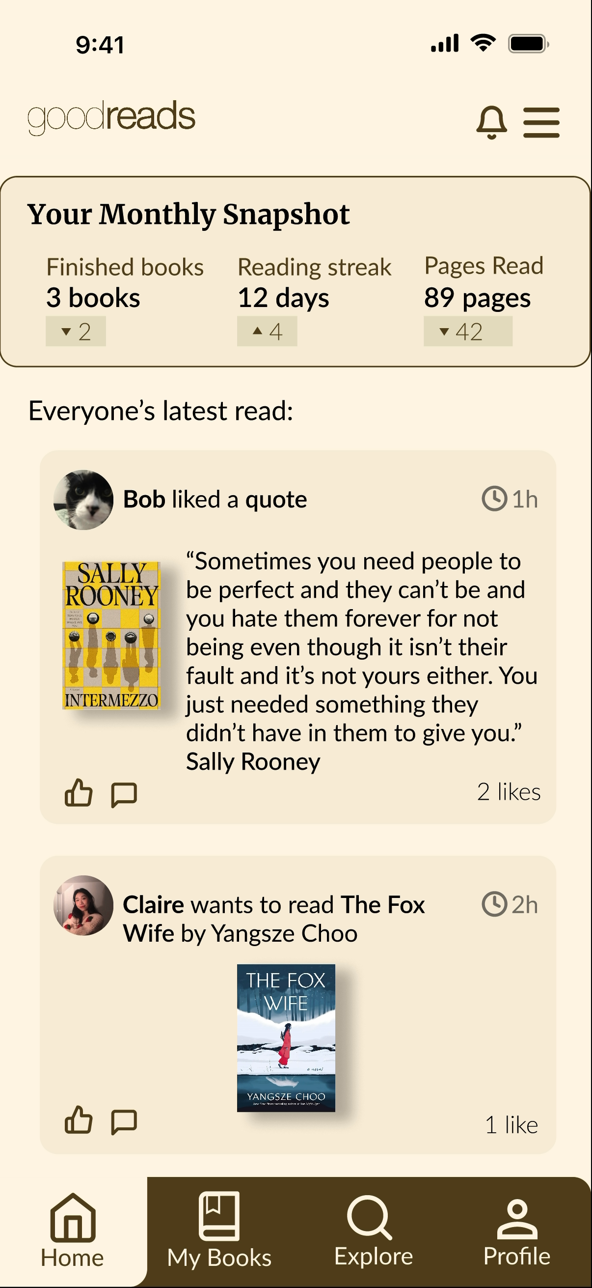 Users come to Goodreads primarily to track their reading and browse books, but accessing your own profile requires navigating into a hamburger menu, Search and Discover are redundantly separated into different tabs, and the home feed is cluttered with low-value notifications. The Power User put it plainly: “Accessing my profile shouldn’t be buried in the menu.” The Casual Tracker noted that the menu was full of features she’d never once used: “Giveaways? Who is using that?”